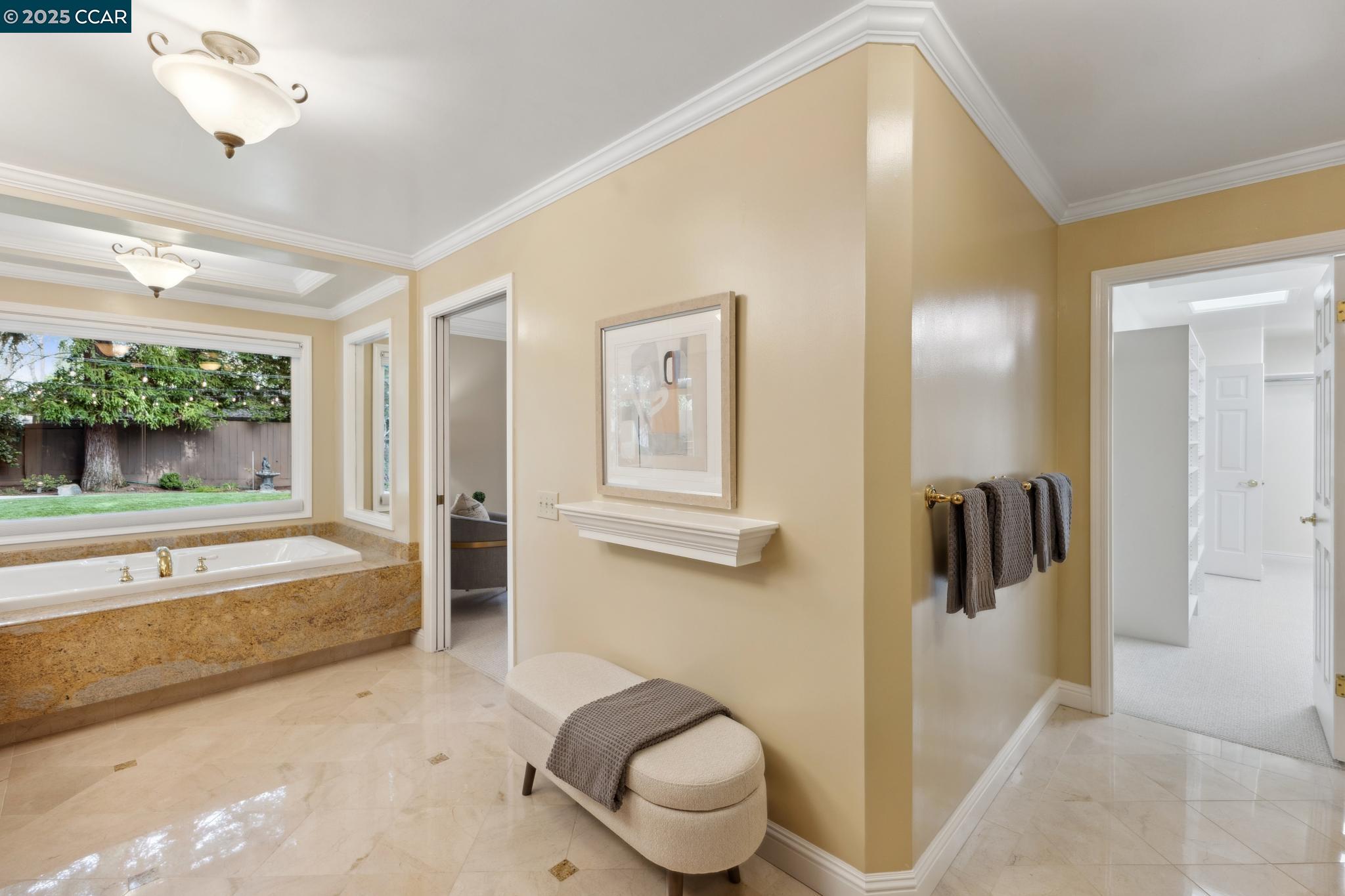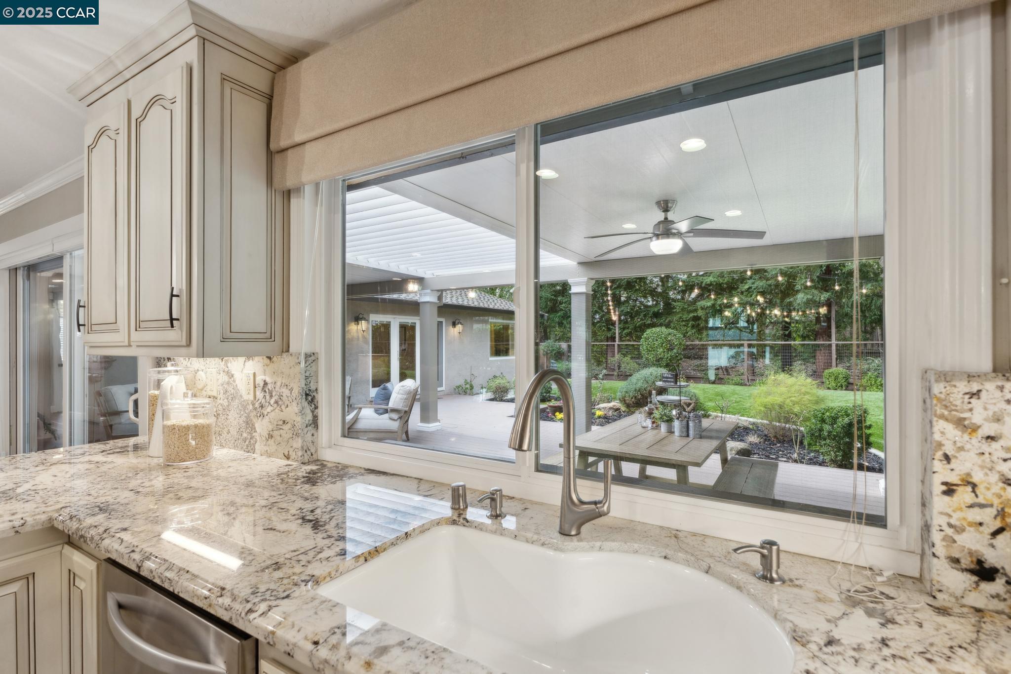 Enjoy a bright, open-concept great room with walls of windows that flood the space with natural light. The stunning kitchen has stainless steel appliances, granite counters and plenty of storage. The spacious updated primary suite which opens to the park-like backyard includes a double vanity, soaking tub, separate shower and expansive walk-in closet. Updates throughout include new carpet in the bedrooms, luxury vinyl plank flooring with the look of hardwood in the main living area, and custom window treatments.